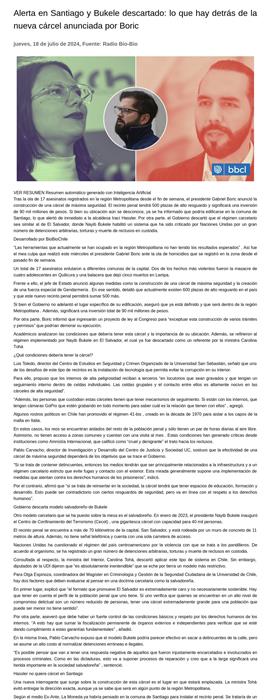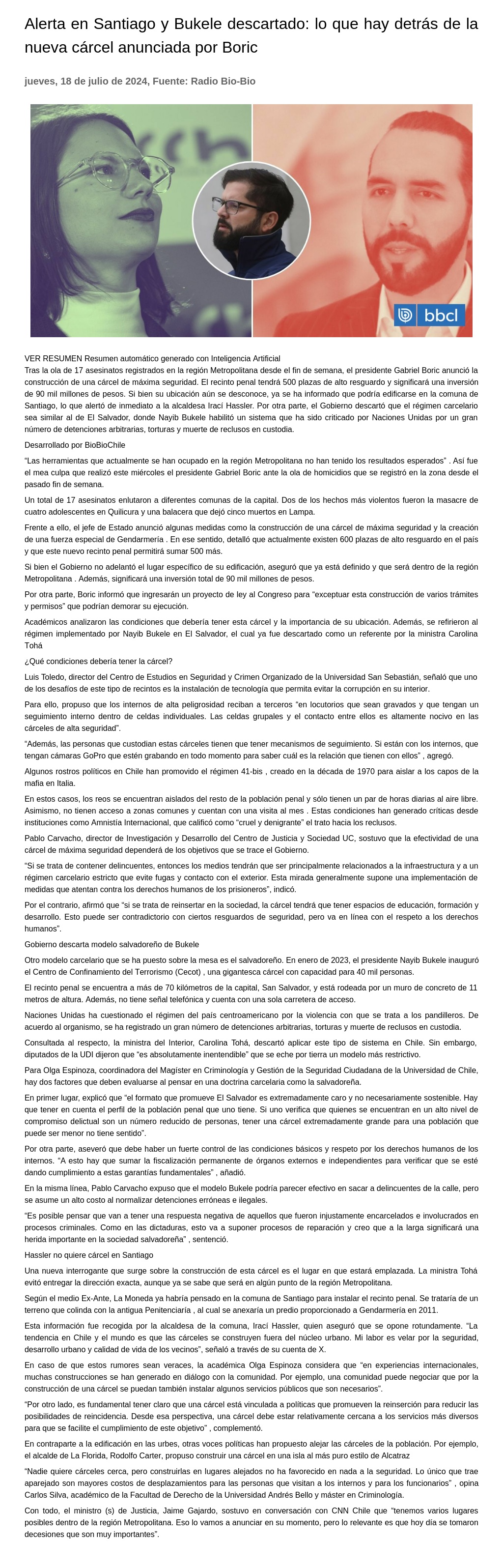Alerta en Santiago y Bukele descartado: lo que hay detrás de la nueva cárcel anunciada por Boric 18-07-2024 Radio Bio-Bio VER RESUMEN Resumen automático generado con Inteligencia Artificial Tras la ola de 17 asesinatos registrados en la región Metropolitana desde el fin de semana, el presidente Gabriel Boric anunci... |