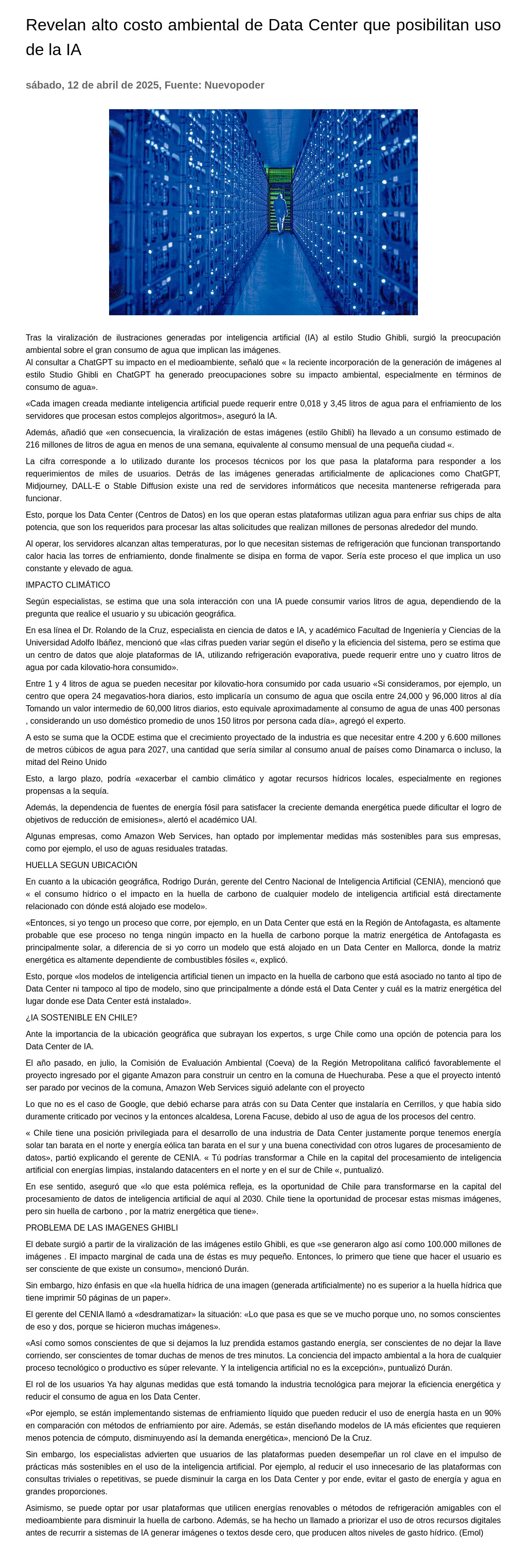 Revelan alto costo ambiental de Data Center que posibilitan uso de la IA 12-04-2025 Nuevopoder Tras la viralización de ilustraciones generadas por inteligencia artificial (IA) al estilo Studio Ghibli, surgió la preocupación ambiental sobre el gran consumo de agua que implican las imágenes. <... |