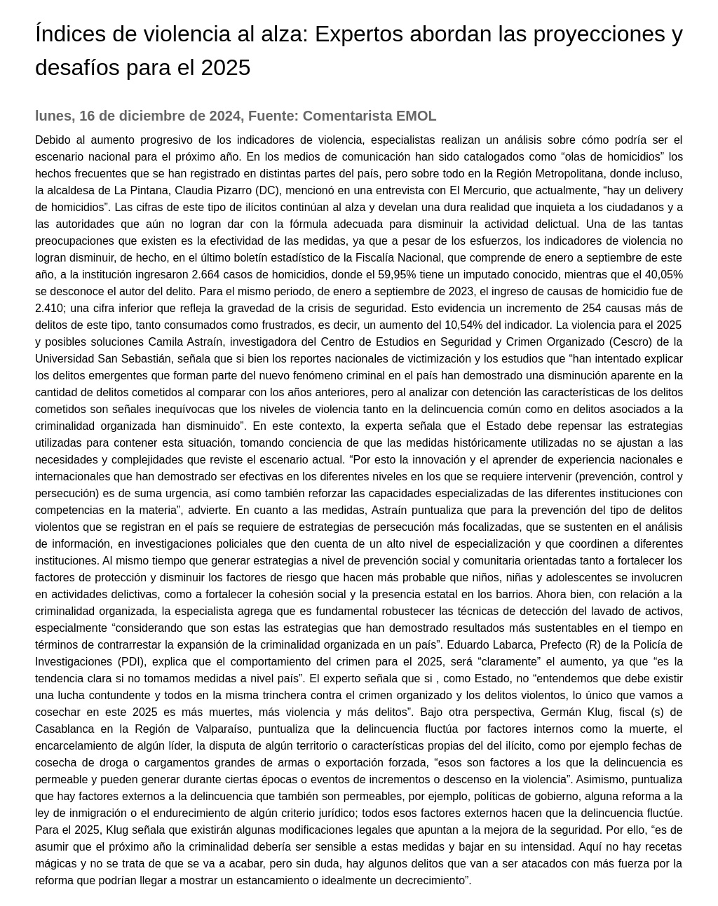 La violencia para el 2025 y posibles soluciones Camila Astraín, investigadora del Centro de Estudios en Seguridad y Crimen Organizado (