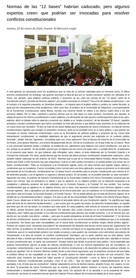 Normas “agotadas”, concebidas para una “única aplicación” Para el decano de Derecho de la Universidad de los Andes, Jose Ignacio Martínez, una lectura desapasionada del art. 154 de la Constitución, en la que están las 12 bases, “lleva a una conclusión bastante simple y modesta: se trataba de eso, parámetros para elaborar una nueva Constitución, una que no fue, porque no se aprobó”. En tal sentido, precisa que “el objetivo de esa norma era súper claro, y cumplió dicho fin, al plasmarse en el proyecto esas bases, sin que hubieran sido infringidas; pero, reitero, el texto elaborado por la Comisión Experta y el Consejo fue rechazado.