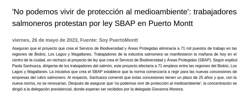 Trabajadores de la industria salmonera se manifestaron la mañana de hoy en el centro de la ciudad, en rechazo al proyecto de ley que crea el Servicio de Biodiversidad y Áreas Protegidas (SBAP). Según explicó Paola Sanhueza, dirigenta de los trabajadores del salmón, este proyecto afectaría a 71 empleos entre las regiones del Biobío, Los Lagos y Magallanes. La iniciativa que crea el SBAP establece que la norma comenzaría a regir para las nuevas concesiones de empresas del rubro salmonero. Al respecto, Sanhueza comentó que estas concesiones tienen un plazo de 25 años y que, con la nueva norma, no se renovarían. Después de asegurar que "no podemos vivir de protección al medioambiente", la concentración se dirigió a la delegación presidencial, donde esperan ser recibidos por la delegada Giovanna Moreira.