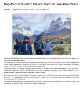 Una delegación de nueve tour operadores de Brasil y un periodista del diario Folha de Sao Paulo visitó la Región de Magallanes, en una iniciativa organizada por las oficinas de ProChile en Sao Paulo y Punta Arenas, con el objetivo de posicionar la Patagonia chilena en uno de los mercados turísticos más importantes para el país.