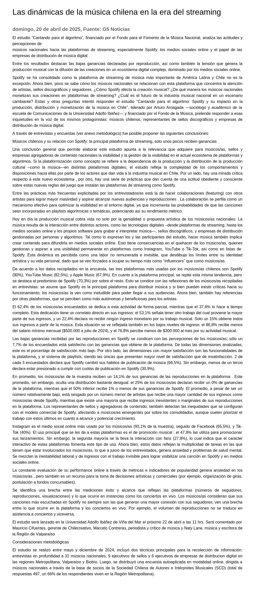 Las dinámicas de la música chilena en la era del streaming 20-04-2025 G5 Noticias El estudio “Cantando para el algoritmo”, financiado por el Fondo para el Fomento de la Música Nacional, analiza las actitudes y percepciones de músicos nacionales hacia las plataformas de stream... |