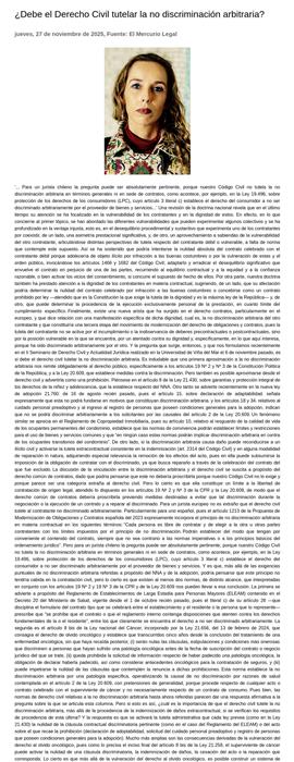 "... Para un jurista chileno la pregunta puede ser absolutamente pertinente, porque nuestro Código Civil no tutela la no discriminación arbitraria en términos generales ni en sede de contratos, como acontece, por ejemplo, en la Ley 19.496, sobre protección de los derechos de los consumidores (LPC), cuyo artículo 3 literal c) establece el derecho del consumidor a no ser discriminado arbitrariamente por el proveedor de bienes y servicios.. ." Una revisión de la doctrina nacional revela que en el último tiempo su atención se ha focalizado en la vulnerabilidad de los contratantes y en la dignidad de estos.