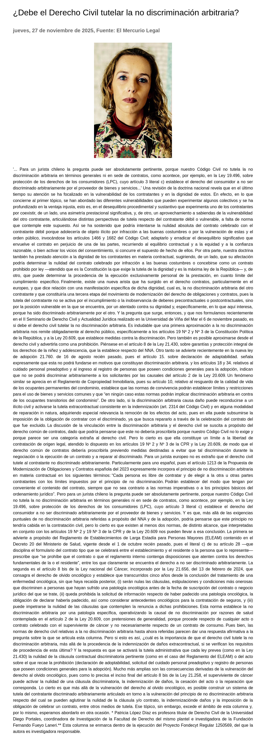 Universidad Diego Portales, coordinadora de Investigación de la Facultad de Derecho del mismo plantel e investigadora de la Fundación Fernando Fueyo Laneri. ** Esta columna se enmarca dentro de la ejecución del Proyecto Fondecyt Regular 1250569, del que la autora es investigadora responsable.