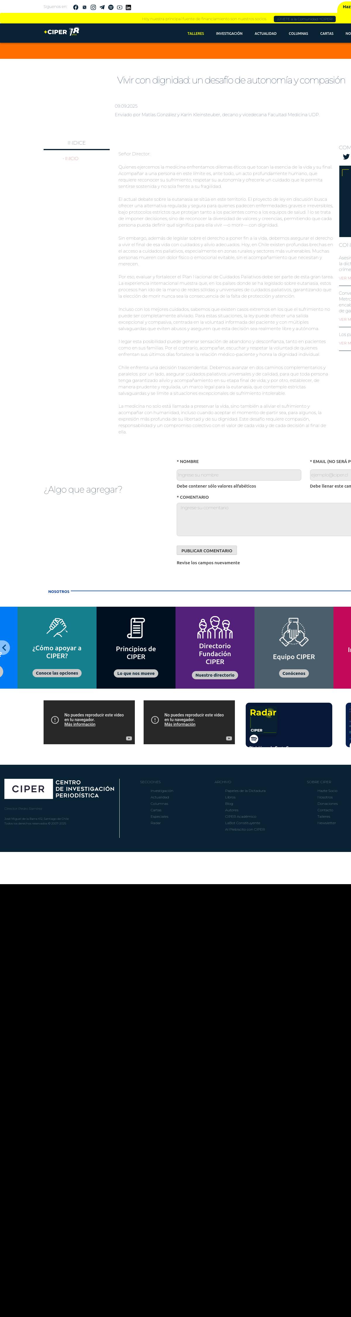 Vivir con dignidad: un desafío de autonomía y compasión 09-09-2025 CiperChile Señor Director: Quienes ejercemos la medicina enfrentamos dilemas éticos que tocan la esencia de la vida y su final. Acompañar a una persona en este límite es, ante todo, un acto profundamente ... |