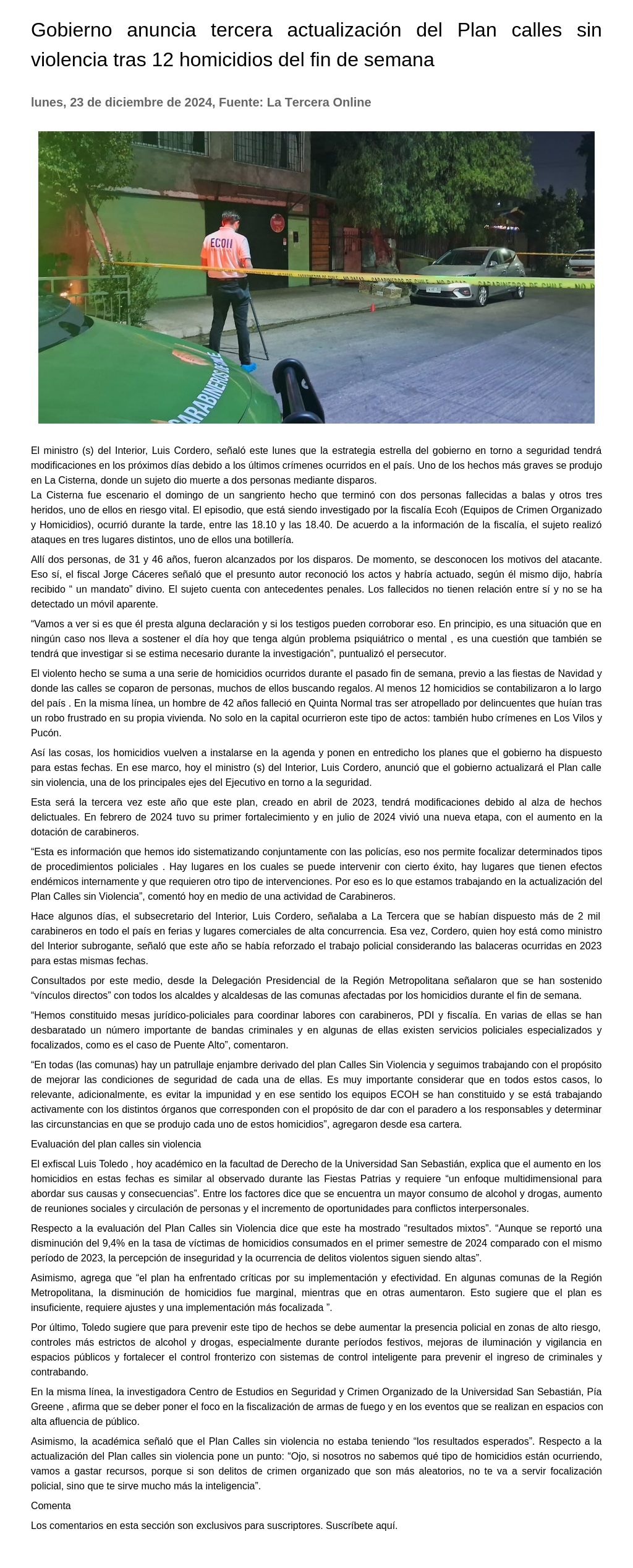 Gobierno anuncia tercera actualización del Plan calles sin violencia tras 12 homicidios del fin de semana 23-12-2024 La Tercera Online El ministro (s) del Interior, Luis Cordero, señaló este lunes que la estrategia estrella del gobierno en torno a seguridad tendrá modificaciones en los próximos días debido a los últimos crímenes o... |