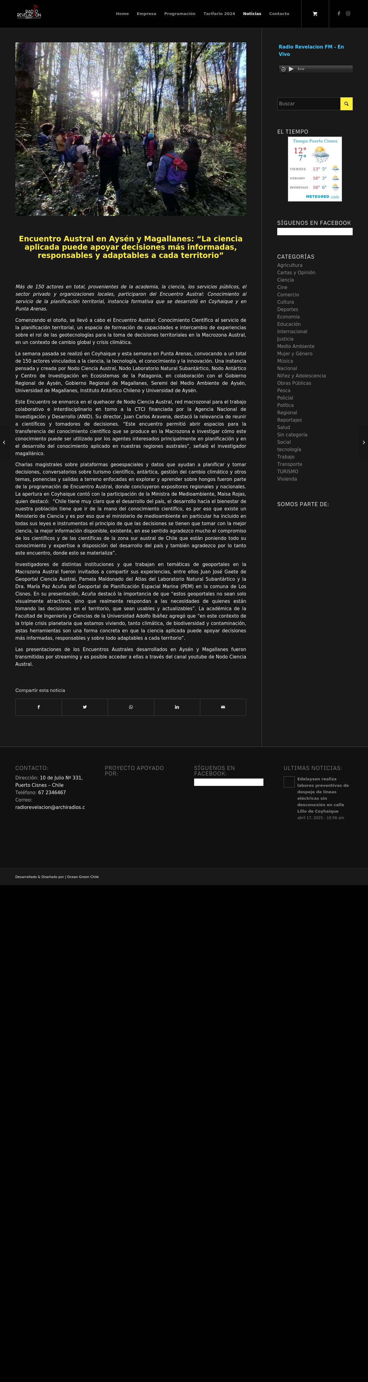 Encuentro Austral en Aysén y Magallanes: “La ciencia aplicada puede apoyar decisiones más informadas, responsables y adaptables a cada territorio” 17-04-2025 Radio Revelacion FM Más de 150 actores en total, provenientes de la academia, la ciencia, los servicios públicos, el sector privado y organizaciones locales, participaron del Encuentro Austral: Conocimiento al s... |