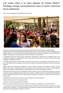 ¿Te cuesta volver a la rutina después de Fiestas Patrias? Psicóloga entrega recomendaciones para el retorno emocional tras la celebración 22-09-2025 pauta.cl La vuelta a la rutina luego de varios días de desconexión puede generar sensación de desánimo, irritabilidad o fatiga. Después de casi cuatro días de celebración de las Fiestas Patrias, volver... |