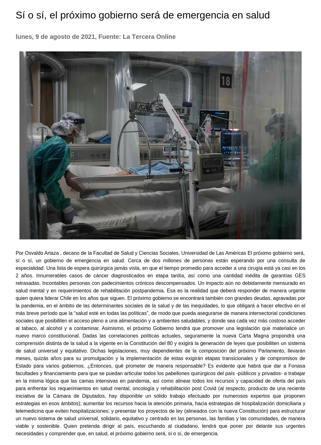 Universidad de Las Américas El próximo gobierno será, sí o sí, un gobierno de emergencia en salud. Cerca de dos millones de personas están esperando por una consulta de especialidad. Una lista de espera quirúrgica jamás vista, en que el tiempo promedio para acceder a una cirugía está ya casi en los 2 años. Innumerables casos de cáncer diagnosticados en etapa tardía, así como una cantidad inédita de garantías GES retrasadas. Incontables personas con padecimientos crónicos descompensados. Un impacto aún no debidamente mensurado en salud mental y en requerimientos de rehabilitación postpandemia. Esa es la realidad que deberá responder de manera urgente quien quiera liderar Chile en los años que siguen.