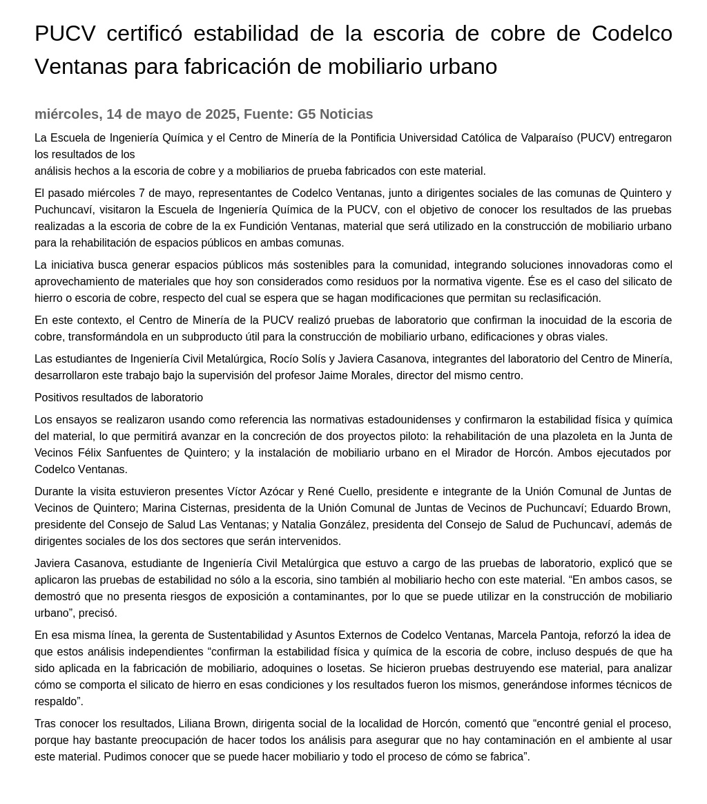PUCV certificó estabilidad de la escoria de cobre de Codelco Ventanas para fabricación de mobiliario urbano 14-05-2025 G5 Noticias La Escuela de Ingeniería Química y el Centro de Minería de la Pontificia Universidad Católica de Valparaíso (PUCV) entregaron los resultados de los análisis hechos a la escoria de cobre y a mobili... |