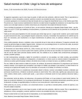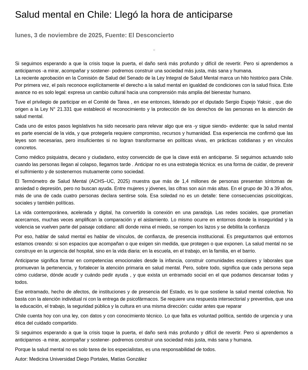 Salud mental en Chile: Llegó la hora de anticiparse 03-11-2025 El Desconcierto Si seguimos esperando a que la crisis toque la puerta, el daño será más profundo y difícil de revertir. Pero si aprendemos a anticiparnos -a mirar, acompañar y sostener- podremos construir una s... |
