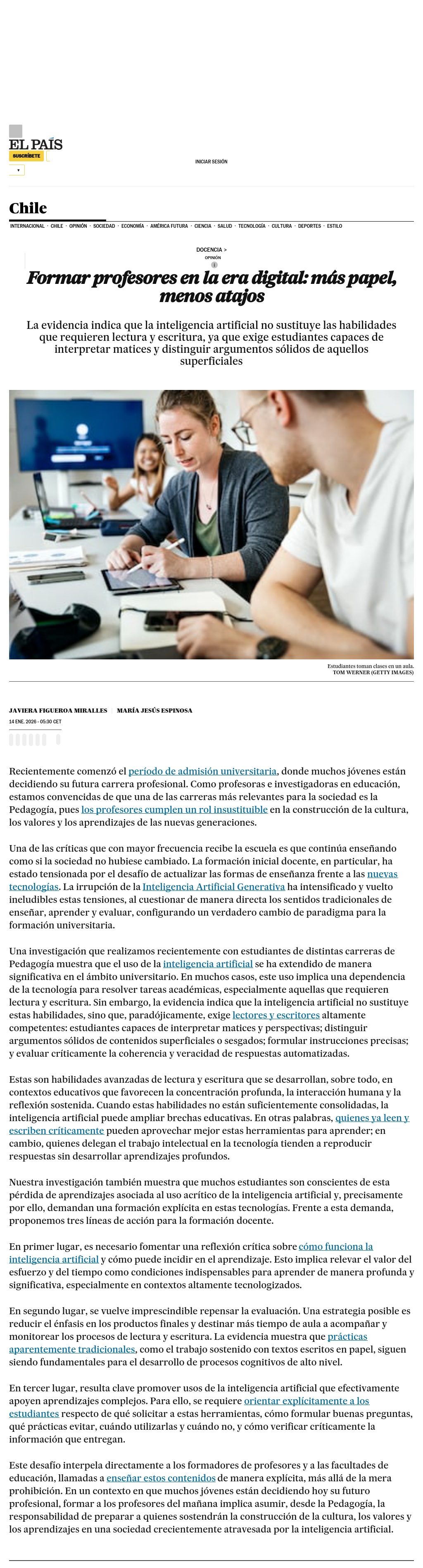 La evidencia indica que la inteligencia artificial no sustituye las habilidades que requieren lectura y escritura, ya que exige estudiantes capaces de interpretar matices y distinguir argumentos sólidos de aquellos superficiales Recientemente comenzó el período de admisión universitaria, donde muchos jóvenes están decidiendo su futura carrera profesional. Como profesoras e investigadoras en educación, estamos convencidas de que una de las carreras más relevantes para la sociedad es la Pedagogía, pues los profesores cumplen un rol insustituible en la construcción de la cultura, los valores y los aprendizajes de las nuevas generaciones. Una de las críticas que con mayor frecuencia recibe la escuela es que continúa enseñando como si la sociedad no hubiese cambiado. La formación inicial docente, en particular, ha estado tensionada por el desafío de actualizar las formas de enseñanza frente a las nuevas tecnologías. La irrupción de la Inteligencia Artificial Generativa ha intensificado y vuelto ineludibles estas tensiones, al cuestionar de manera directa los sentidos tradicionales de enseñar, aprender y evaluar, configurando un verdadero cambio de paradigma para la formación universitaria. Una investigación que realizamos recientemente con estudiantes de distintas carreras de Pedagogía muestra que el uso de la inteligencia artificial se ha extendido de manera significativa en el ámbito universitario. En muchos casos, este uso implica una dependencia de la tecnología para resolver tareas académicas, especialmente aquellas que requieren lectura y escritura. Sin embargo, la evidencia indica que la inteligencia artificial no sustituye estas habilidades, sino que, paradójicamente, exige lectores y escritores altamente competentes: estudiantes capaces de interpretar matices y perspectivas; distinguir argumentos sólidos de contenidos superficiales o sesgados; formular instrucciones precisas; y evaluar críticamente la coherencia y veracidad de respuestas automatizadas. Estas son habilidades avanzadas de lectura y escritura que se desarrollan, sobre todo, en contextos educativos que favorecen la concentración profunda, la interacción humana y la reflexión sostenida. Cuando estas habilidades no están suficientemente consolidadas, la inteligencia artificial puede ampliar brechas educativas. En otras palabras, quienes ya leen y escriben críticamente pueden aprovechar mejor estas herramientas para aprender; en cambio, quienes delegan el trabajo intelectual en la tecnología tienden a reproducir respuestas sin desarrollar aprendizajes profundos. Nuestra investigación también muestra que muchos estudiantes son conscientes de esta pérdida de aprendizajes asociada al uso acrítico de la inteligencia artificial y, precisamente por ello, demandan una formación explícita en estas tecnologías. Frente a esta demanda, proponemos tres líneas de acción para la formación docente. En primer lugar, es necesario fomentar una reflexión crítica sobre cómo funciona la inteligencia artificial y cómo puede incidir en el aprendizaje. Esto implica relevar el valor del esfuerzo y del tiempo como condiciones indispensables para aprender de manera profunda y significativa, especialmente en contextos altamente tecnologizados. En segundo lugar, se vuelve imprescindible repensar la evaluación. Una estrategia posible es reducir el énfasis en los productos finales y destinar más tiempo de aula a acompañar y monitorear los procesos de lectura y escritura. La evidencia muestra que prácticas aparentemente tradicionales, como el trabajo sostenido con textos escritos en papel, siguen siendo fundamentales para el desarrollo de procesos cognitivos de alto nivel. En tercer lugar, resulta clave promover usos de la inteligencia artificial que efectivamente apoyen aprendizajes complejos. Para ello, se requiere orientar explícitamente a los estudiantes respecto de qué solicitar a estas herramientas, cómo formular buenas preguntas, qué prácticas evitar, cuándo utilizarlas y cuándo no, y cómo verificar críticamente la información que entregan. Este desafío interpela directamente a los formadores de profesores y a las facultades de educación, llamadas a enseñar estos contenidos de manera explícita, más allá de la mera prohibición. En un contexto en que muchos jóvenes están decidiendo hoy su futuro profesional, formar a los profesores del mañana implica asumir, desde la Pedagogía, la responsabilidad de preparar a quienes sostendrán la construcción de la cultura, los valores y los aprendizajes en una sociedad crecientemente atravesada por la inteligencia artificial. Javiera Figueroa Miralles es académica de la facultad de Educación de la Universidad Alberto Hurtado María Jesús Espinosa es académica de la facultad de Educación de la Universidad Diego Portales Tu suscripción se está usando en otro dispositivo ¿ Quieres añadir otro usuario a tu suscripción? Añadir usuario Continuar leyendo aquí Si continúas leyendo en este dispositivo, no se podrá leer en el otro. ¿Por qué estás viendo esto? Flecha Tu suscripción se está usando en otro dispositivo y solo puedes acceder a EL PAÍS desde un dispositivo a la vez. Si quieres compartir tu cuenta, cambia tu suscripción a la modalidad Premium, así podrás añadir otro usuario. Cada uno accederá con su propia cuenta de email, lo que os permitirá personalizar vuestra experiencia en EL PAÍS. ¿Tienes una suscripción de empresa? Accede aquí para contratar más cuentas. En el caso de no saber quién está usando tu cuenta, te recomendamos cambiar tu contraseña aquí. Si decides continuar compartiendo tu cuenta, este mensaje se mostrará en tu dispositivo y en el de la otra persona que está usando tu cuenta de forma indefinida, afectando a tu experiencia de lectura. Puedes consultar aquí los términos y condiciones de la suscripción digital.|