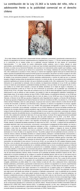 La contribución de la Ley 21.363 a la tutela del niño, niña o adolescente frente a la publicidad comercial en el derecho chileno 23-08-2021 El Mercurio.com ...De un lado, fortalece esta tutela frente a determinadas ilicitudes publicitarias, promoviendo y garantizando la observancia de su derecho a la seguridad en el consumo, específicamente de su int... |