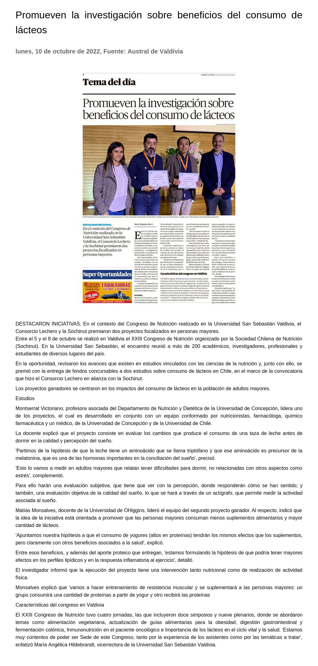 Promueven la investigación sobre beneficios del consumo de lácteos 10-10-2022 Austral de Valdivia DESTACARON INICIATIVAS. En el contexto del Congreso de Nutrición realizado en la Universidad San Sebastián Valdivia, el Consorcio Lechero y la Sochinut premiaron dos proyectos focalizados en pers... |