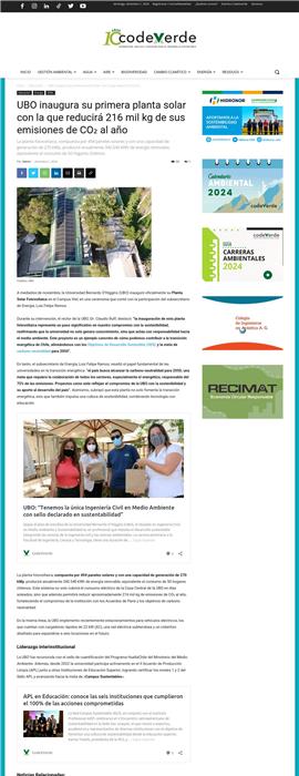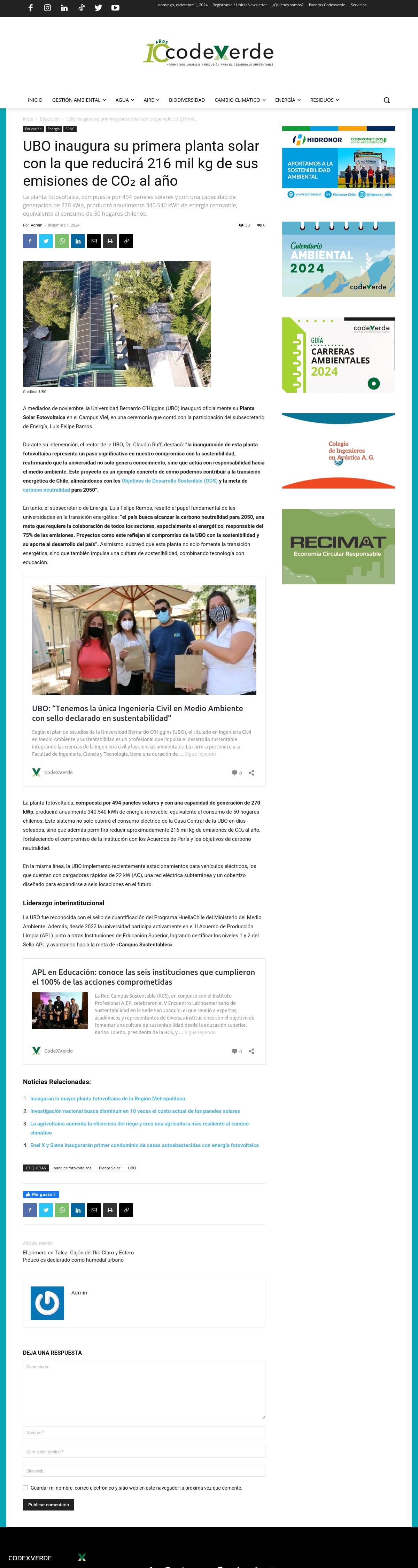 UBO inaugura su primera planta solar con la que reducirá 216 mil kg de sus emisiones de CO2 al año 02-12-2024 Codex Verde A mediados de noviembre, la Universidad Bernardo OHiggins (UBO) inauguró oficialmente su Planta Solar Fotovoltaica en el Campus Viel, en una ceremonia que contó con la participación del subsecre... |
