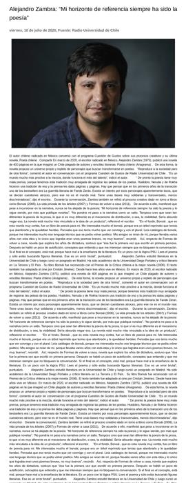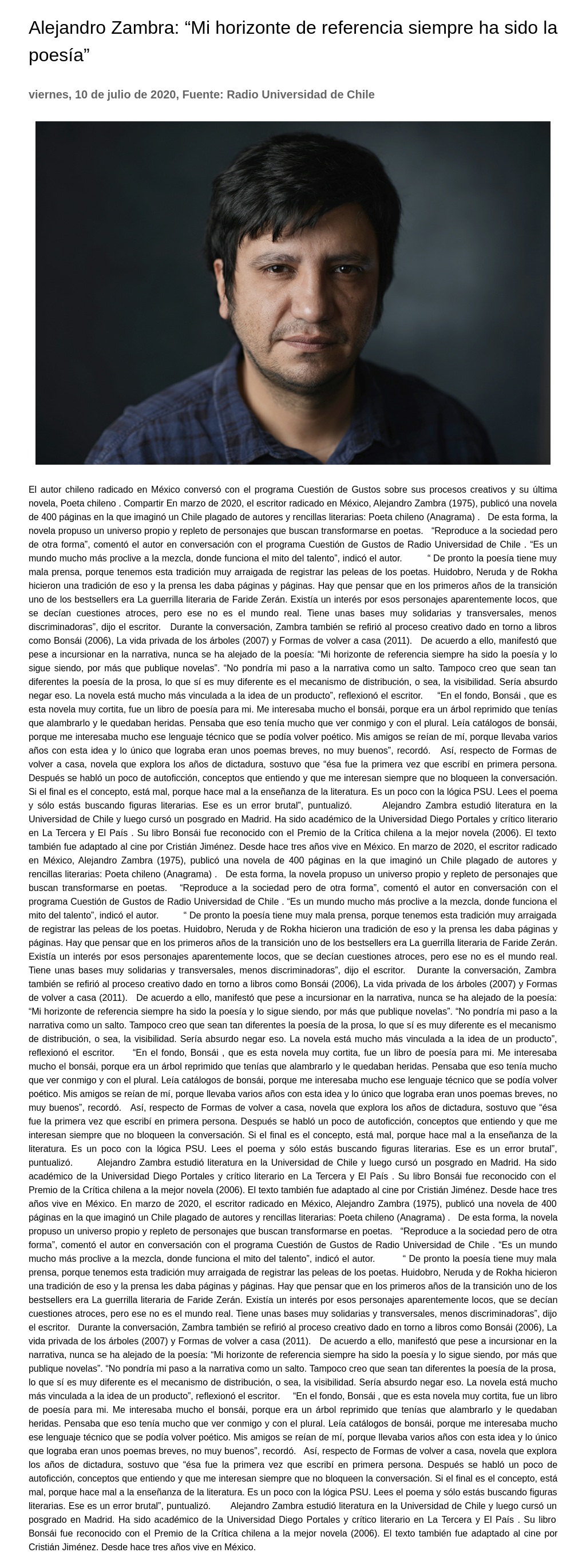 Mis amigos se reían de mí, porque llevaba varios años con esta idea y lo único que lograba eran unos poemas breves, no muy buenos”, recordó. Así, respecto de Formas de volver a casa, novela que explora los años de dictadura, sostuvo que “ésa fue la primera vez que escribí en primera persona. Después se habló un poco de autoficción, conceptos que entiendo y que me interesan siempre que no bloqueen la conversación. Si el final es el concepto, está mal, porque hace mal a la enseñanza de la literatura. Es un poco con la lógica PSU. Lees el poema y sólo estás buscando figuras literarias. Ese es un error brutal”, puntualizó. Alejandro Zambra estudió literatura en la Universidad de Chile y luego cursó un posgrado en Madrid. Ha sido académico de la Universidad Diego Portales y crítico literario en La Tercera y El País. Su libro Bonsái fue reconocido con el Premio de la Crítica chilena a la mejor novela (2006). El texto también fue adaptado al cine por Cristián Jiménez. Desde hace tres años vive en México.
