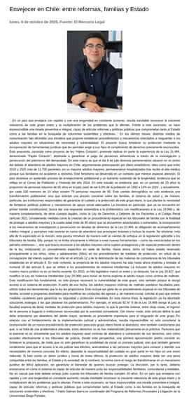 Si bien existe un deber jurídico y moral de estos últimos, la protección de adultos mayores debe ser una tarea compartida entre las familias, el Estado y la sociedad; de lo contrario, la norma corre el riesgo de transformarse en un mecanismo punitivo de difícil aplicación, sin garantizar el bienestar de quienes buscan proteger. La discusión, por lo tanto, debería enmarcarse en cómo el sistema es capaz de articular de manera justa las responsabilidades familiares, comunitarias y estatales. No es casual que este debate emerja justo cuando los tribunales de familia cumplen 20 años. En un país que envejece con rapidez y con una longevidad en constante aumento, resulta inevitable reconocer la creciente relevancia de este grupo etario y la multiplicación de los problemas que lo afectan.
