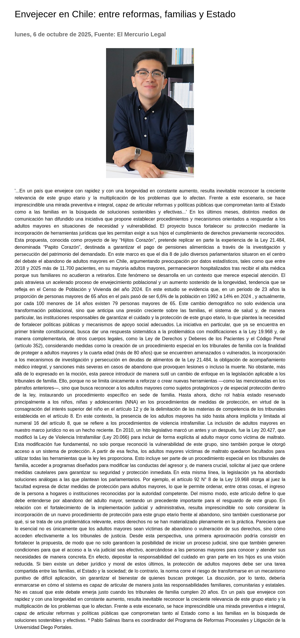 Frente a este escenario, se hace imprescindible una mirada preventiva e integral, capaz de articular reformas y políticas públicas que comprometan tanto al Estado como a las familias en la búsqueda de soluciones sostenibles y efectivas.. ." En los últimos meses, distintos medios de comunicación han difundido una iniciativa que propone establecer procedimientos y mecanismos orientados a resguardar a los adultos mayores en situaciones de necesidad y vulnerabilidad. El proyecto busca fortalecer su protección mediante la incorporación de herramientas jurídicas que les permitan exigir a sus hijos el cumplimiento de derechos previamente reconocidos.