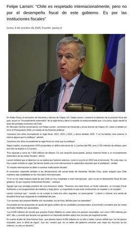 Felipe Larraín: “Chile es respetado internacionalmente, pero no por el desempeño fiscal de este gobierno. Es por las instituciones fiscales” 06-10-2025 pauta.cl En Radio Pauta, el exministro de Hacienda y director de Clapes UC, Felipe Larraín, cuestionó el deterioro de la posición fiscal del país, acusó un “incumplimiento sistemático” de la regla fiscal ... |