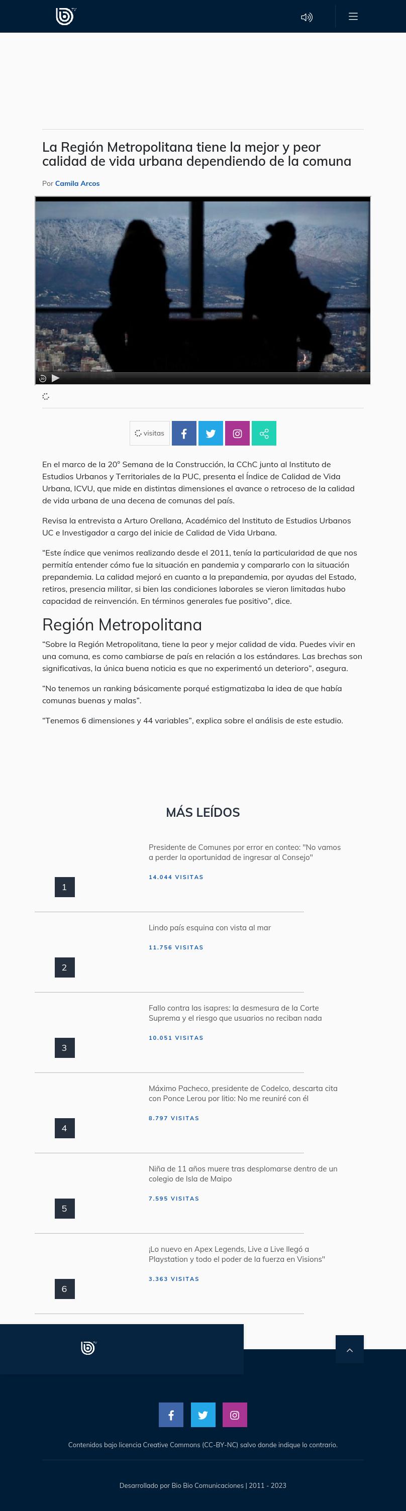 CChC junto al Instituto de Estudios Urbanos y Territoriales de la PUC, presenta el Índice de Calidad de Vida Urbana, ICVU, que mide en distintas dimensiones el avance o retroceso de la calidad de vida urbana de una decena de comunas del país. Revisa la entrevista a Arturo Orellana, Académico del Instituto de Estudios Urbanos UC e Investigador a cargo del inicie de Calidad de Vida Urbana. “Este índice que venimos realizando desde el 2011, tenía la particularidad de que nos permitía entender cómo fue la situación en pandemia y compararlo con la situación prepandemia. La calidad mejoró en cuanto a la prepandemia, por ayudas del Estado, retiros, presencia militar, si bien las condiciones laborales se vieron limitadas hubo capacidad de reinvención. En términos generales fue positivo”, dice. Región Metropolitana “Sobre la Región Metropolitana, tiene la peor y mejor calidad de vida. Puedes vivir en una comuna, es como cambiarse de país en relación a los estándares. Las brechas son significativas, la única buena noticia es que no experimentó un deterioro”, asegura. “No tenemos un ranking básicamente porqué estigmatizaba la idea de que había comunas buenas y malas”. “Tenemos 6 dimensiones y 44 variables”, explica sobre el análisis de este estudio.