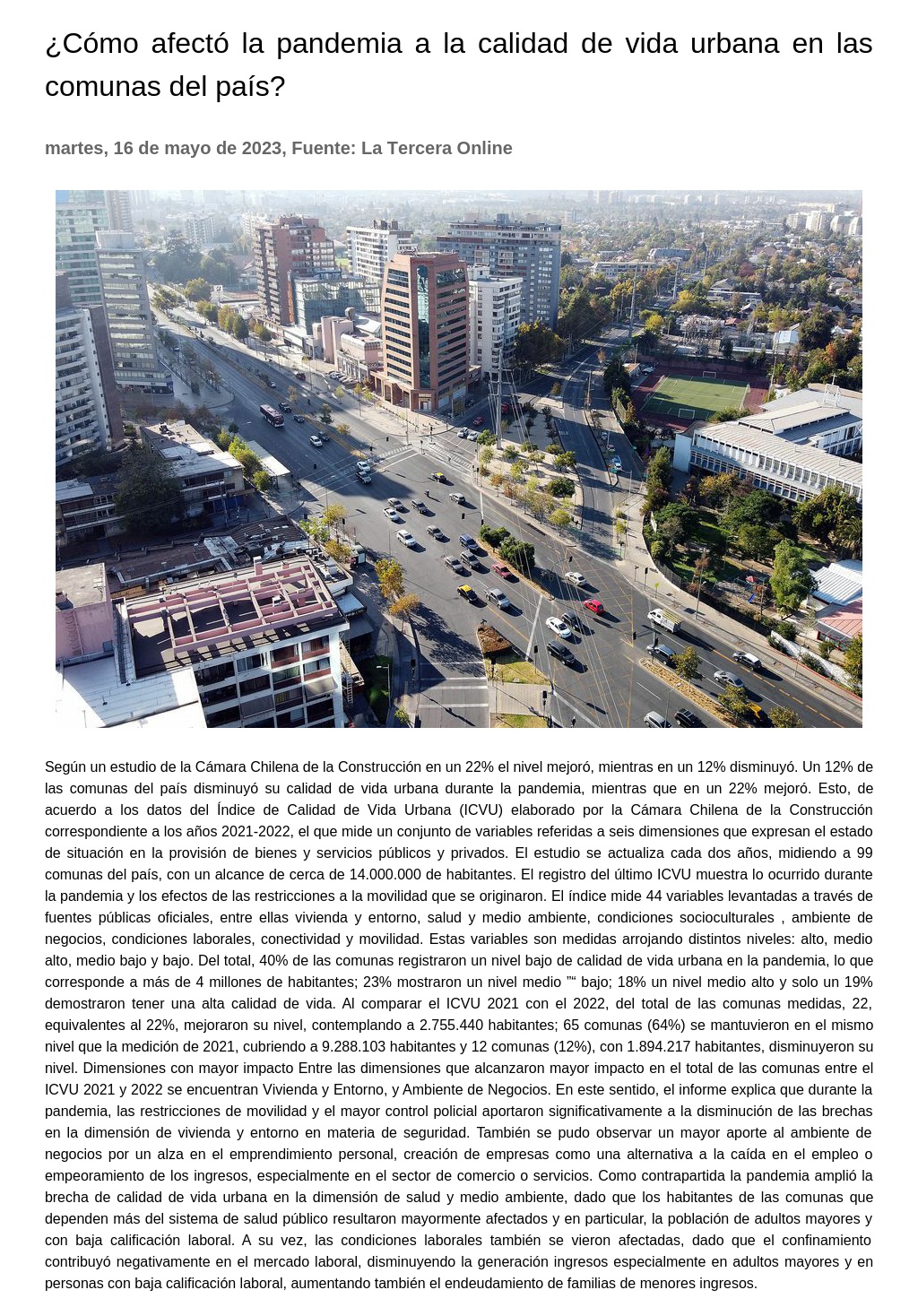 Según un estudio de la Cámara Chilena de la Construcción en un 22% el nivel mejoró, mientras en un 12% disminuyó. Un 12% de las comunas del país disminuyó su calidad de vida urbana durante la pandemia, mientras que en un 22% mejoró.