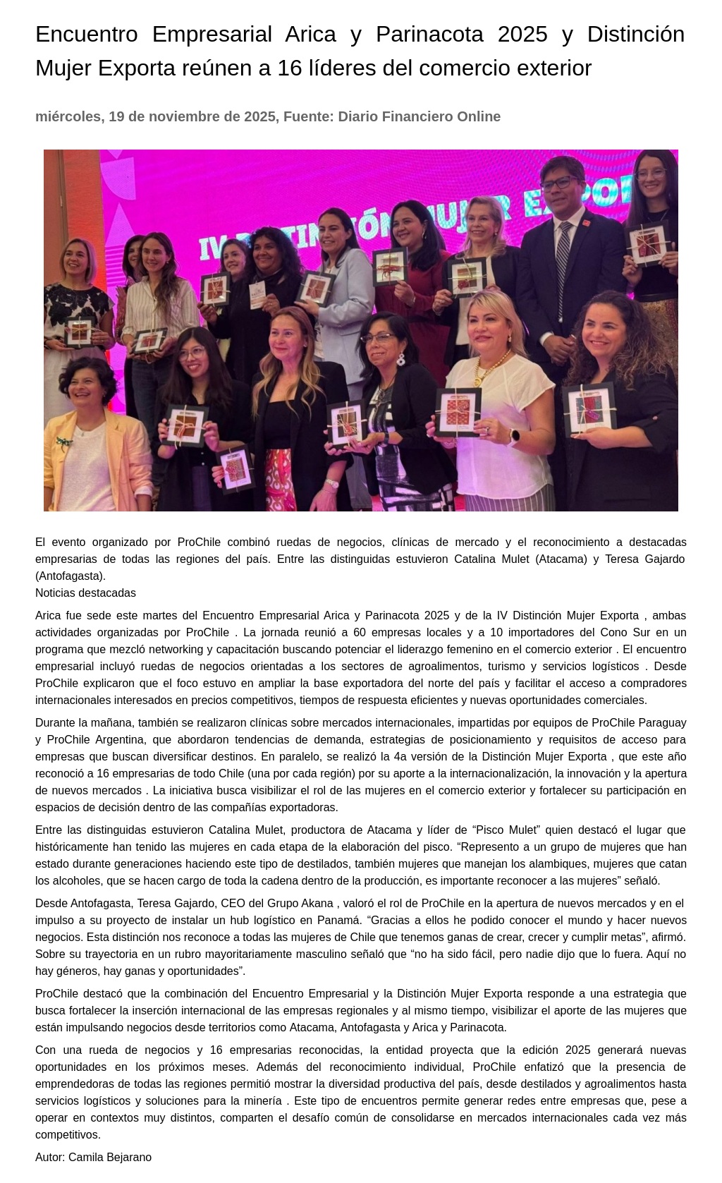 Encuentro Empresarial Arica y Parinacota 2025 y Distinción Mujer Exporta reúnen a 16 líderes del comercio exterior 19-11-2025 Diario Financiero Online El evento organizado por ProChile combinó ruedas de negocios, clínicas de mercado y el reconocimiento a destacadas empresarias de todas las regiones del país. Entre las distinguidas estuvieron Ca... |