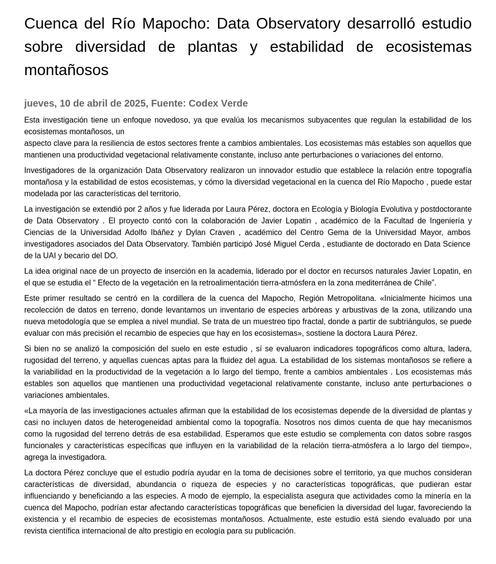 Cuenca del Río Mapocho: Data Observatory desarrolló estudio sobre diversidad de plantas y estabilidad de ecosistemas montañosos 10-04-2025 Codex Verde Esta investigación tiene un enfoque novedoso, ya que evalúa los mecanismos subyacentes que regulan la estabilidad de los ecosistemas montañosos, un aspecto clave para la resiliencia de estos sec... |