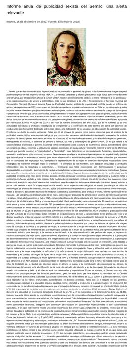 Recientemente el Servicio Nacional del Consumidor (Sernac) difundió el Informe Anual de Publicidad Sexista: análisis de la publicidad en Chile desde un enfoque de género, de septiembre de 2023, cuyo objeto es describir de qué forma la publicidad que circula en Chile en los sitios webs y redes sociales retrata a hombres y mujeres de manera estereotipada, cosifica o reduce los atributos sexuales del cuerpo de las mujeres y perpetúa la idea de que ciertas actividades, comportamientos u objetos son apropiados solo para un género, específicamente tratándose de los niños, niñas y adolescentes (NNA).,