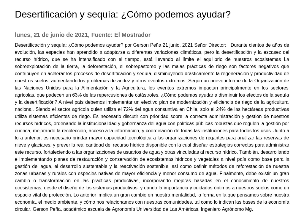 Desertificación y sequía: ¿ Cómo podemos ayudar? por Gerson Peña 21 junio, 2021 Señor Director: Durante cientos de años de evolución, las especies han aprendido a adaptarse a diferentes variaciones climáticas, pero la desertificación y la escasez del recurso hídrico, que se ha intensificado con el tiempo, está llevando al límite el equilibrio de nuestros ecosistemas La sobreexplotación de la tierra, la deforestación, el sobrepastoreo y las malas prácticas de riego son factores negativos que contribuyen en acelerar los procesos de desertificación y sequía, disminuyendo drásticamente la regeneración y productividad de nuestros suelos, aumentando los problemas de aridez y otros eventos extremos. Según un nuevo informe de la Organización de las Naciones Unidas para la Alimentación y la Agricultura, los eventos extremos impactan principalmente en los sectores agrícolas, que padecen un 63% de las repercusiones de catástrofes. ¿Cómo podemos ayudar a disminuir los efectos de la sequía y la desertificación? A nivel país debemos implementar un efectivo plan de modernización y eficiencia de riego de la agricultura nacional. Siendo el sector agrícola quien utiliza el 72% del agua consuntiva en Chile, solo el 24% de las hectáreas productivas utiliza sistemas eficientes de riego. Es necesario discutir con prioridad sobre la correcta administración y gestión de nuestros recursos hídricos, ordenando la institucionalidad y gobernanza del agua con políticas públicas robustas que regulen la gestión por cuenca, mejorando la recolección, acceso a la información, y coordinación de todas las instituciones para todos los usos. Junto a lo a anterior, es necesario brindar mayor capacidad tecnológica a las organizaciones de regantes para analizar las reservas de nieve y glaciares, y prever la real cantidad del recurso hídrico disponible con la cual diseñar estrategias correctas para administrar este recurso, fortaleciendo a las organizaciones de usuarios de agua y otras vinculadas al recurso hídrico. También, desarrollando e implementando planes de restauración y conservación de ecosistemas hídricos y vegetales a nivel país como base para la gestión del agua, el desarrollo sustentable y la reactivación sostenible, así como definir métodos de reforestación de nuestra zonas urbanas y rurales con especies nativas de mayor eficiencia y menor consumo de agua. Finalmente, debe existir un gran cambio o transformación en las prácticas productivas, incorporando mejoras basadas en el conocimiento de nuestros ecosistemas, desde el diseño de los sistemas productivos, y dando la importancia y cuidados óptimos a nuestros suelos como un espacio vital de protección. Lo anterior implica un gran cambio en nuestra mentalidad, la forma en la que pensamos sobre nuestra economía, el medio ambiente, y cómo nos relacionamos con nuestras comunidades, tal como lo indican las bases de la economía circular. Gerson Peña, académico escuela de Agronomía Universidad de Las Américas, Ingeniero Agrónomo Mg.|
