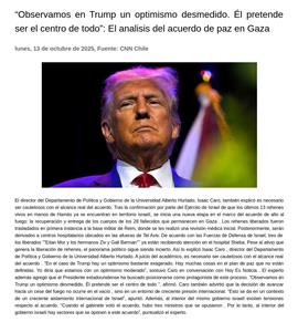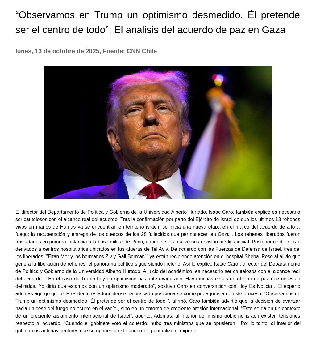 Universidad Alberto Hurtado. A juicio del académico, es necesario ser cautelosos con el alcance real del acuerdo. “En el caso de Trump hay un optimismo bastante exagerado. Hay muchas cosas en el plan de paz que no están definidas. Yo diría que estamos con un optimismo moderado”, sostuvo Caro en conversación con Hoy Es Noticia. El experto además agregó que el Presidente estadounidense ha buscado posicionarse como protagonista de este proceso. “Observamos en Trump un optimismo desmedido. Él pretende ser el centro de todo ”, afirmó. Caro también advirtió que la decisión de avanzar hacia un cese del fuego no ocurre en el vacío, sino en un entorno de creciente presión internacional. “Esto se da en un contexto de un creciente aislamiento internacional de Israel”, apuntó. Además, al interior del mismo gobierno israelí existen tensiones respecto al acuerdo. “Cuando el gabinete votó el acuerdo, hubo tres ministros que se opusieron. Por lo tanto, al interior del gobierno israelí hay sectores que se oponen a este acuerdo”, puntualizó el experto.