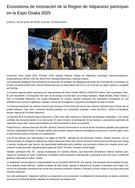 Ecosistema de innovación de la Región de Valparaíso participan en la Expo Osaka 2025 10-07-2025 El Martutino innovación, Expo Osaka 2025, ProChile, EIVA, startups chilenas, Región de Valparaíso, tecnología, internacionalización, emprendimiento, MIVOS, Plan 3D, MUSTACH, Humboldt Electronics, ind... |
