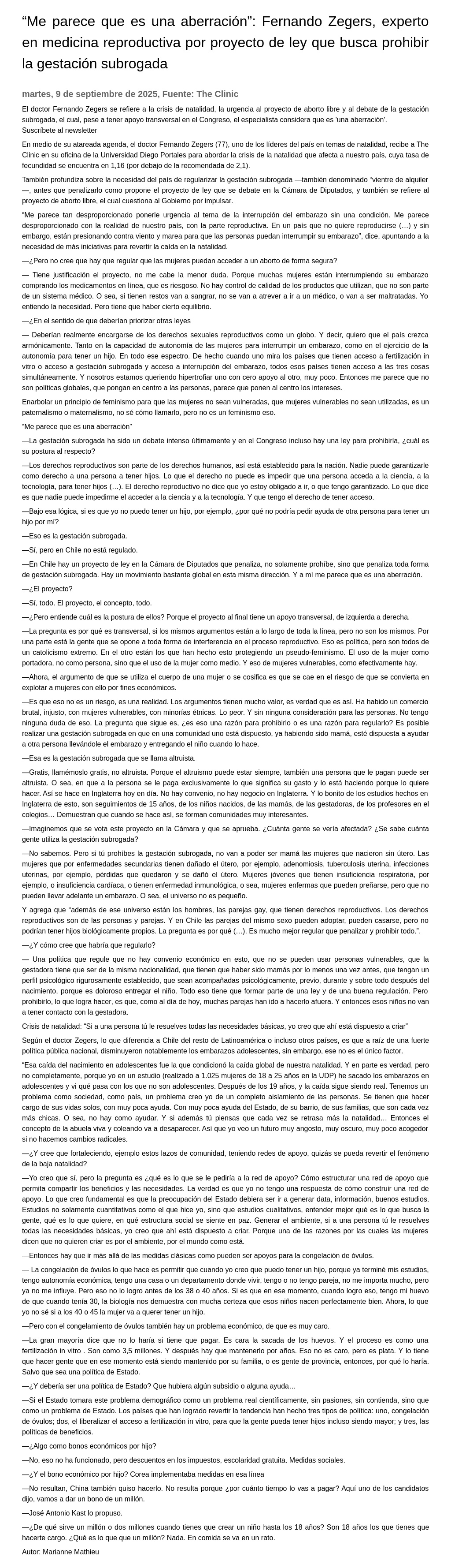 “Me parece que es una aberración”: Fernando Zegers, experto en medicina reproductiva por proyecto de ley que busca prohibir la gestación subrogada 09-09-2025 The Clinic El doctor Fernando Zegers se refiere a la crisis de natalidad, la urgencia al proyecto de aborto libre y al debate de la gestación subrogada, el cual, pese a tener apoyo transversal en el Congreso... |