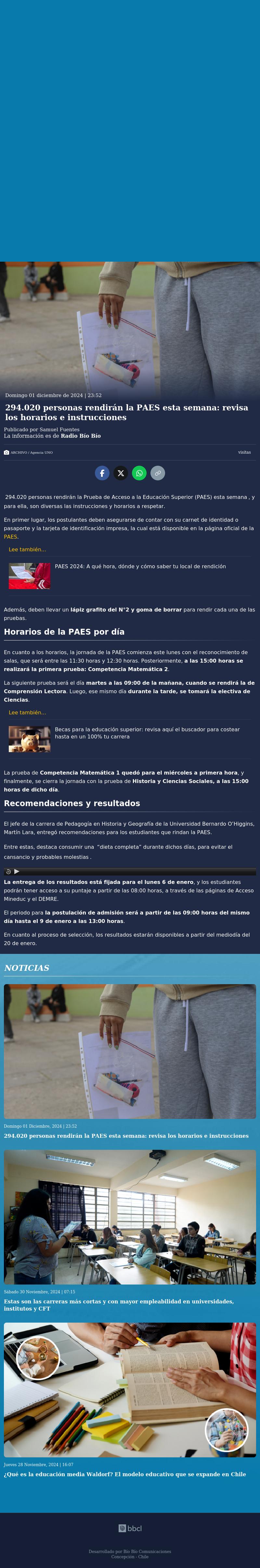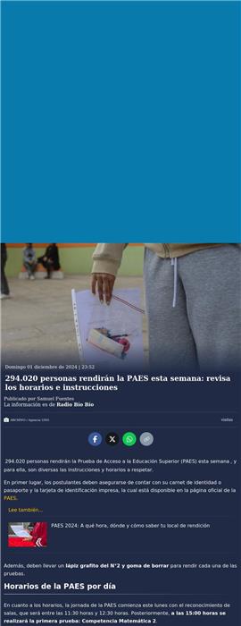 294.020 personas rendirán la PAES esta semana: revisa los horarios e instrucciones 02-12-2024 Radio Bio-Bio 294.020 personas rendirán la Prueba de Acceso a la Educación Superior (PAES) esta semana, y para ella, son diversas las instrucciones y horarios a respetar. En primer lugar, los postulantes d... |