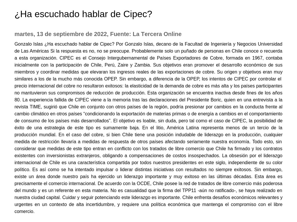 Sin embargo, a diferencia de la OPEP, los intentos de CIPEC por controlar el precio internacional del cobre no resultaron exitosos: la elasticidad de la demanda de cobre es más alta y los países participantes no mantuvieron sus compromisos de reducción de producción., La experiencia fallida de CIPEC viene a la memoria tras las declaraciones del Presidente Boric, quien en una entrevista a la revista TIME, sugirió que Chile en conjunto con otros países de la región, podría presionar por cambios en la conducta frente al cambio climático en otros países “condicionando la exportación de materias primas o de energía a cambios en el comportamiento de consumo de los países más desarrollados”?., En el caso del cobre, si bien Chile tiene una posición indudable de liderazgo en la producción, cualquier medida de restricción llevaría a medidas de respuesta de otros países afectando seriamente nuestra economía.