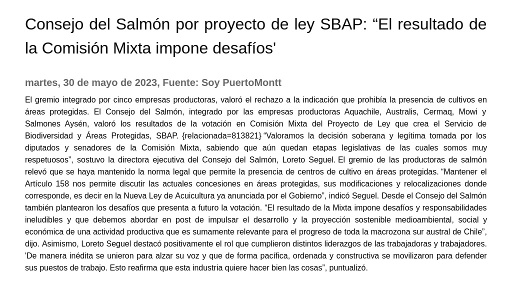 Consejo del Salmón, integrado por las empresas productoras Aquachile, Australis, Cermaq, Mowi y Salmones Aysén, valoró los resultados de la votación en Comisión Mixta del Proyecto de Ley que crea el Servicio de Biodiversidad y Áreas Protegidas, SBAP., {relacionada=813821} “Valoramos la decisión soberana y legítima tomada por los diputados y senadores de la Comisión Mixta, sabiendo que aún quedan etapas legislativas de las cuales somos muy respetuosos”?, sostuvo la directora ejecutiva del