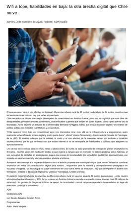 Wifi a tope, habilidades en baja: la otra brecha digital que Chile no ve 02-10-2025 ADN Radio El acceso crece, pero el uso efectivo es desigual: diferencias urbano–rural de 32 puntos y educativas de 34 puntos muestran que no basta con tener internet, hay que saber aprovecharlo. Chile e... |
