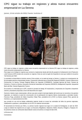 CPC sigue su trabajo en regiones y alista nuevo encuentro empresarial en La Serena 10-10-2024 inoticias.cl CPC sigue su trabajo en regiones y alista nuevo encuentro empresarial en La Serena CPC sigue su trabajo en regiones y alista nuevo encuentro empresarial en La Serena Para seguir con el trabajo en... |