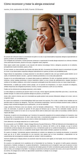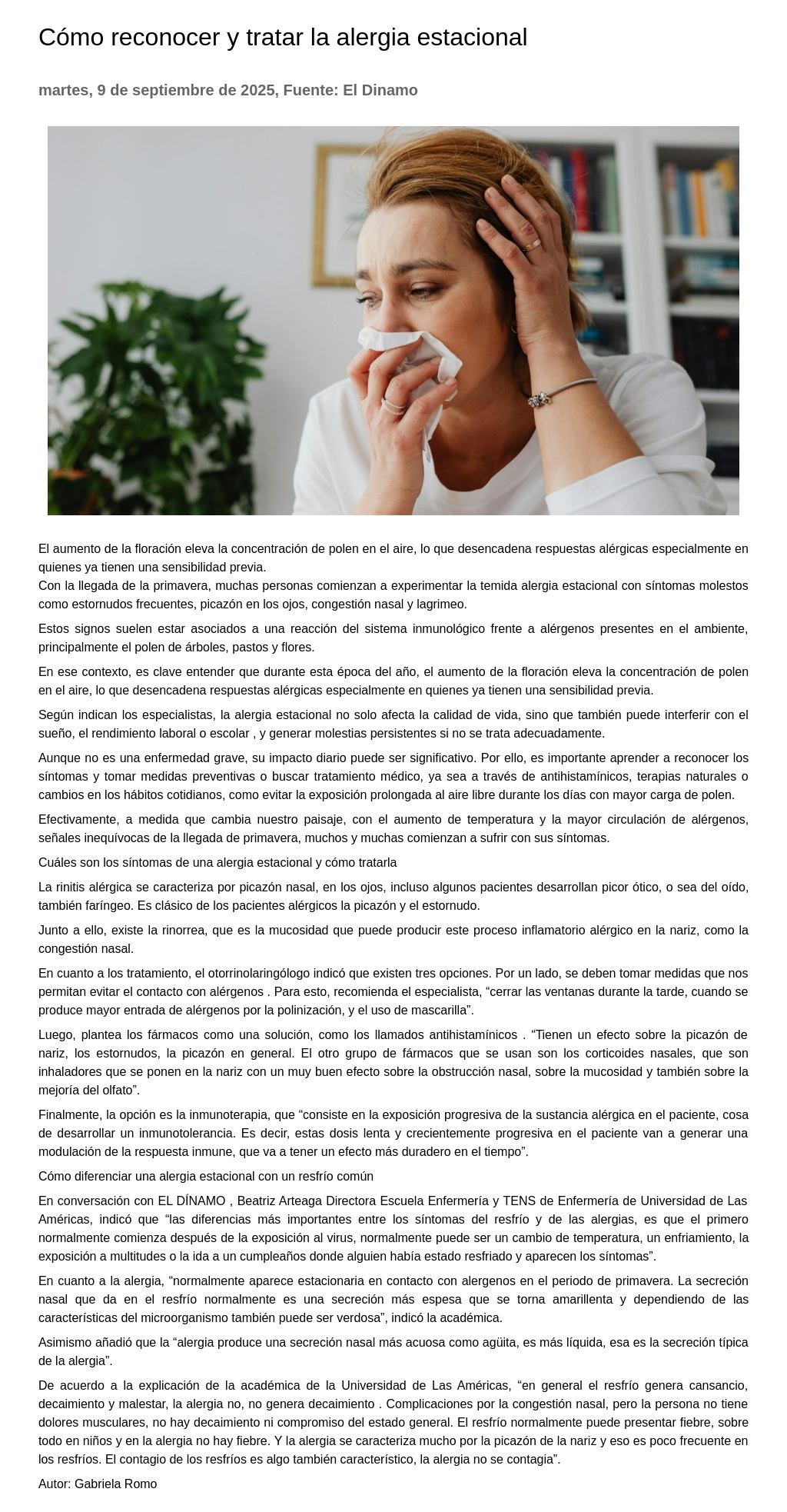 Cómo reconocer y tratar la alergia estacional 09-09-2025 El Dinamo El aumento de la floración eleva la concentración de polen en el aire, lo que desencadena respuestas alérgicas especialmente en quienes ya tienen una sensibilidad previa. Con la llegada de la p... |