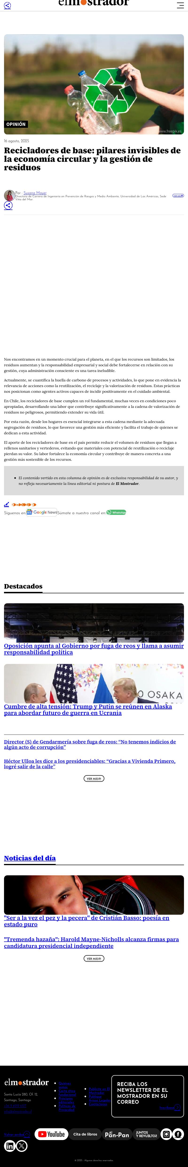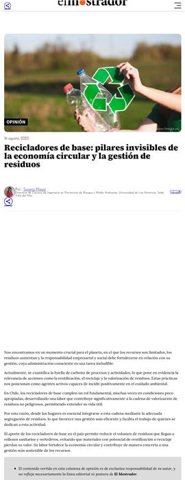 Recicladores de base: pilares invisibles de la economía circular y la gestión de residuos 16-08-2025 El Mostrador Por : Susana Mayer Directora de Carrera de Ingeniería en Prevención de Riesgos y Medio Ambiente, Universidad de Las Américas, Sede Viña del Mar. Nos encontramos en un momento crucial para el p... |