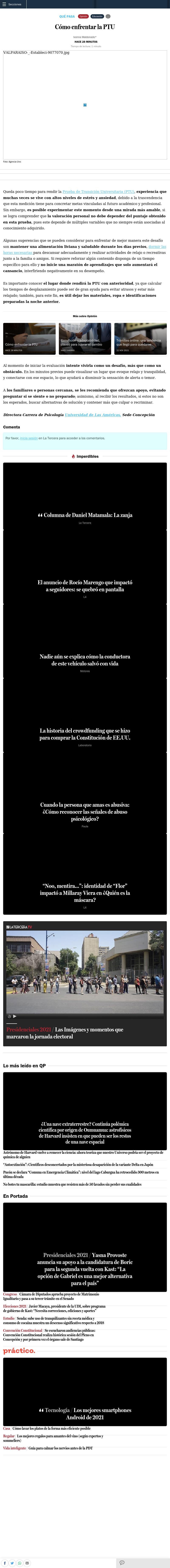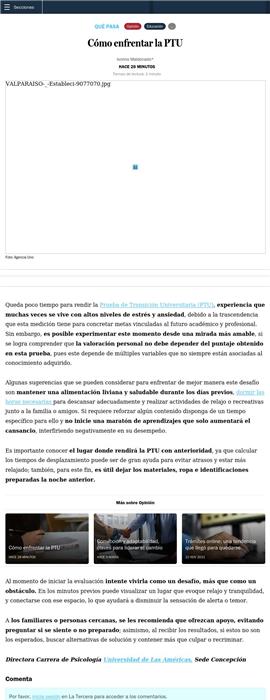 Queda poco tiempo para rendir la Prueba de Transición Universitaria (PTU) , experiencia que muchas veces se vive con altos niveles de estrés y ansiedad , debido a la trascendencia que esta medición tiene para concretar metas vinculadas al futuro académico y profesional., Algunas sugerencias que se pueden considerar para enfrentar de mejor manera este desafío son mantener una alimentación liviana y saludable durante los días previos , dormir las horas necesarias para descansar adecuadamente y realizar actividades de relajo o recreativas junto a la familia o amigos., A los familiares o personas cercanas, se les recomienda que ofrezcan apoyo, evitando preguntar si se siente o no preparado ; asimismo, al recibir los resultados, si estos no son los esperados, buscar alternativas de solución y contener más que culpar o recriminar.