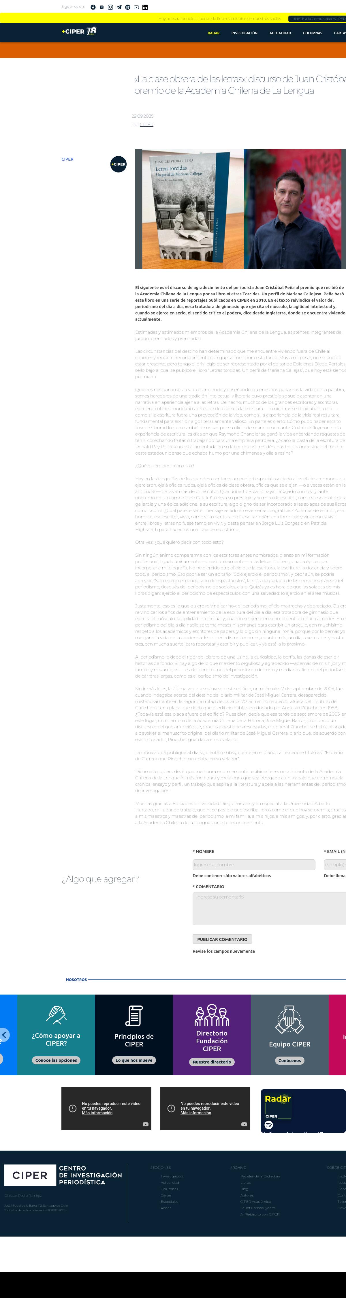 «La clase obrera de las letras»: discurso de Juan Cristóbal Peña para agradecer premio de la Academia Chilena de La Lengua 29-09-2025 CiperChile CIPER El siguiente es el discurso de agradecimiento del periodista Juan Cristóbal Peña al premio que recibió de la Academia Chilena de la Lengua por su libro «Letras Torcidas. Un perfil de Marian... |