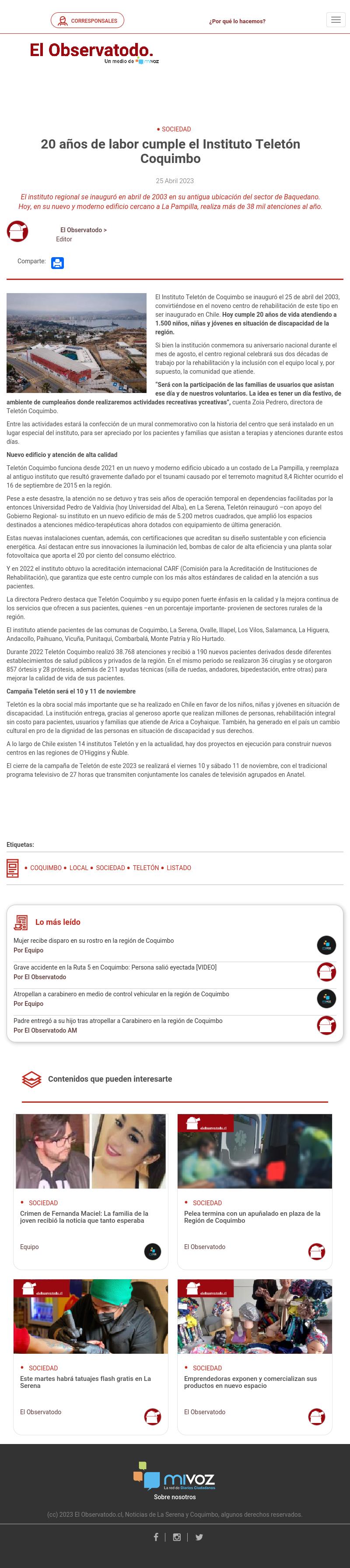 El Instituto Teletón de Coquimbo se inauguró el 25 de abril del 2003, convirtiéndose en el noveno centro de rehabilitación de este tipo en ser inaugurado en Chile. Hoy cumple 20 años de vida atendiendo a 1.500 niños, niñas y jóvenes en situación de discapacidad de la región.
