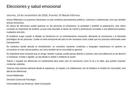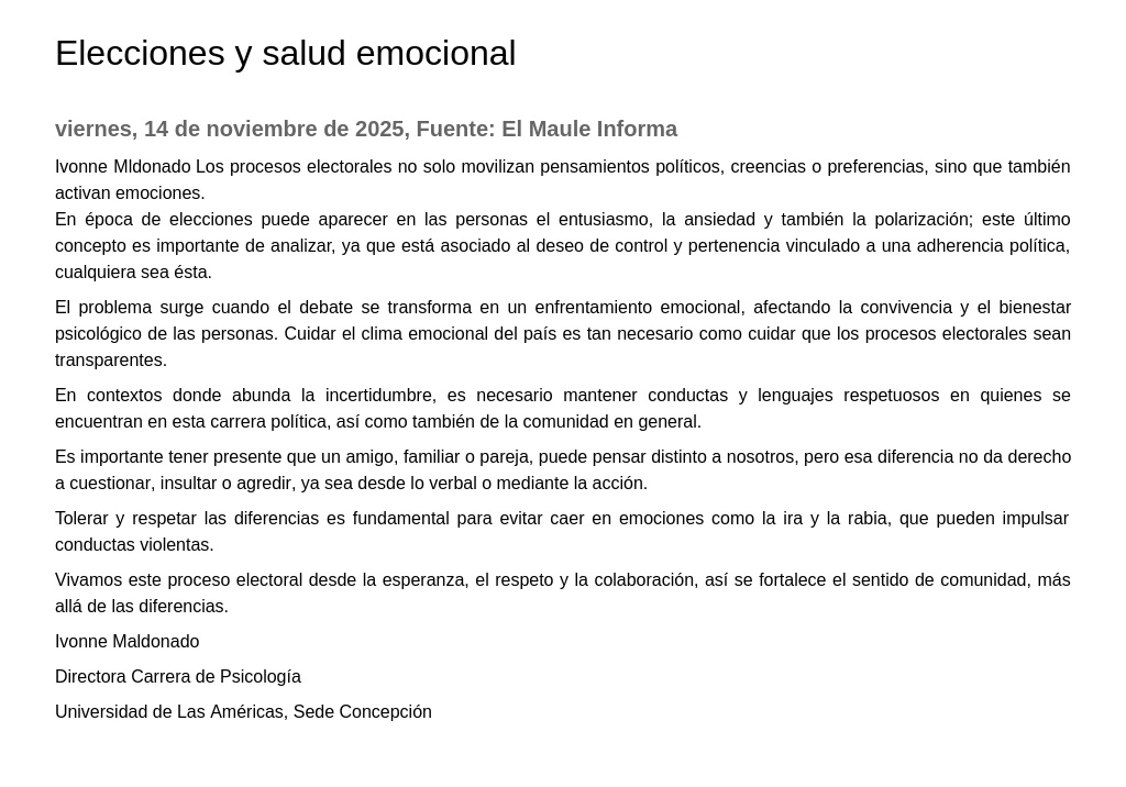 Elecciones y salud emocional 14-11-2025 El Maule Informa Ivonne Mldonado Los procesos electorales no solo movilizan pensamientos políticos, creencias o preferencias, sino que también activan emociones. En época de elecciones puede aparecer en las per... |