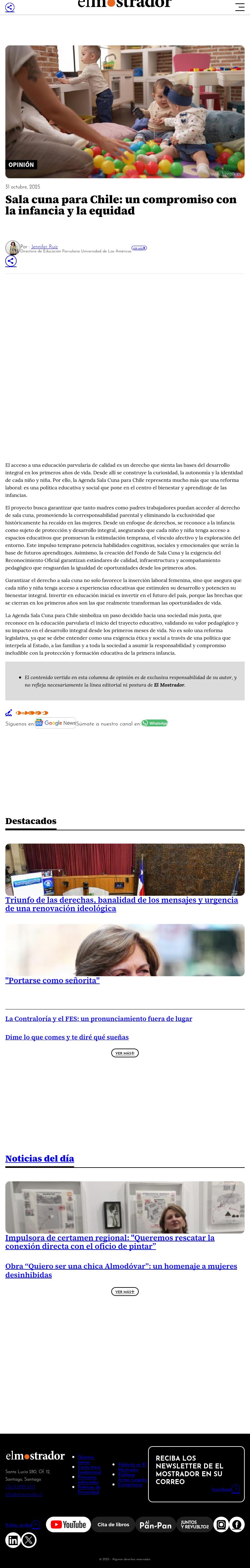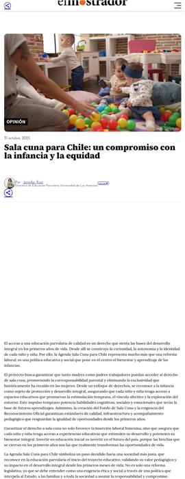 Sala cuna para Chile: un compromiso con la infancia y la equidad 31-10-2025 El Mostrador Por : Jennifer Ruiz Directora de Educación Parvularia Universidad de Las Américas El acceso a una educación parvularia de calidad es un derecho que sienta las bases del desarrollo integral en los... |