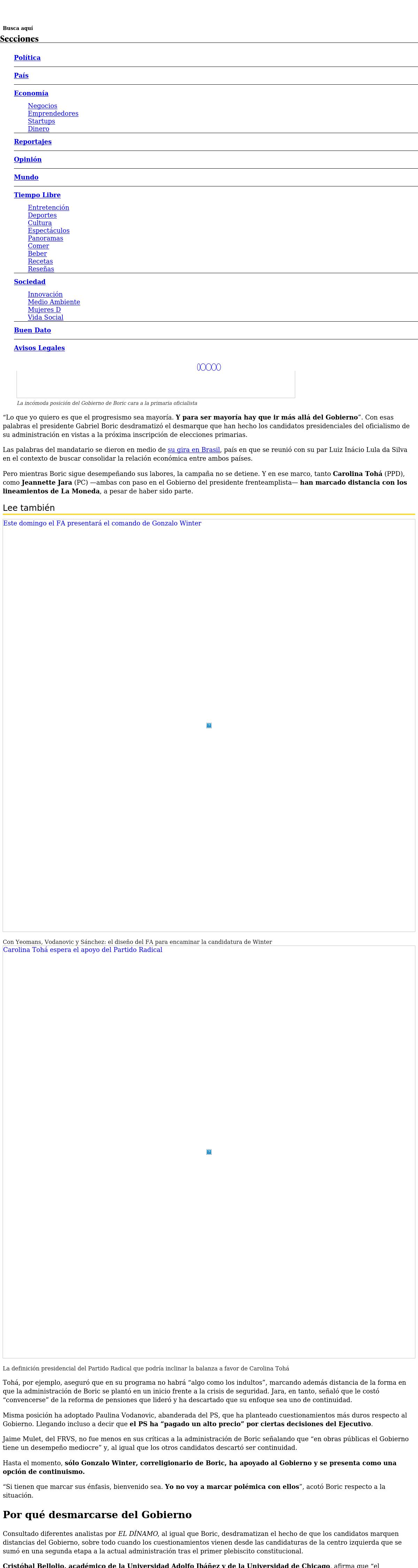 “ Sería un problema para la credibilidad del Gobierno que las plataformas de los candidatos se basaran en demostrar lejanía con el Ejecutivo ”, dice Disy, aunque remarca que, hasta el momento, “ese es no es el caso, a pesar de que hay variaciones obviamente entre Tohá, Jara y Winter. De todas maneras, en general los candidatos también tienen que mostrar cuál es su sello o impronta propia al electorado, y muchas veces implica criticar la gestión actual ”.