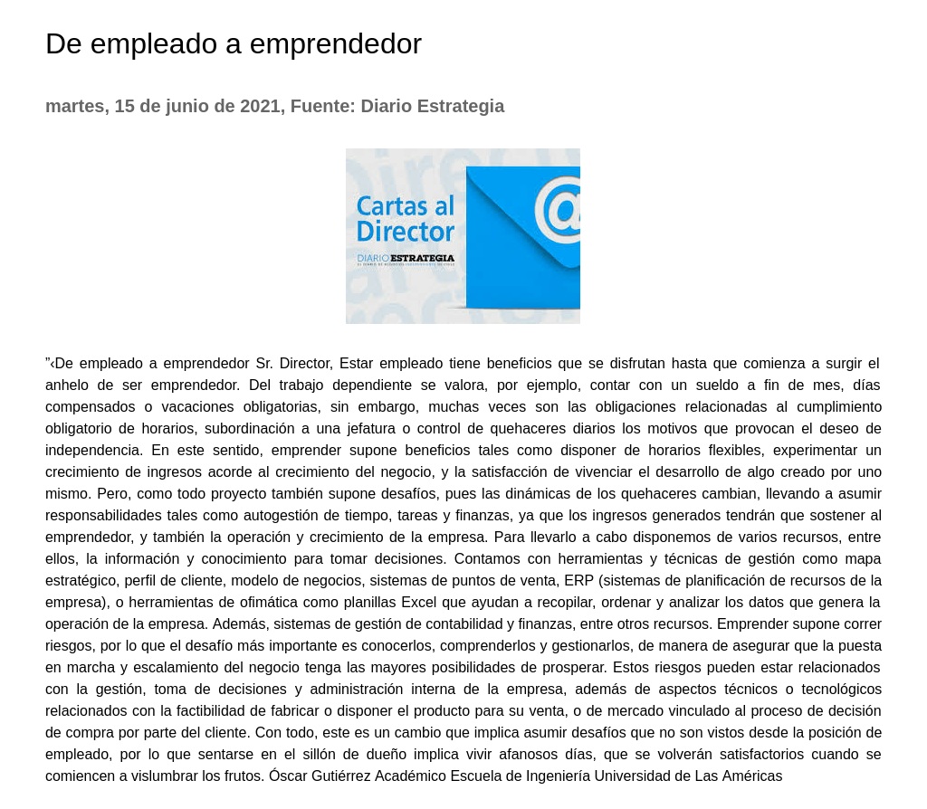 ”‹De empleado a emprendedor Sr. Director, Estar empleado tiene beneficios que se disfrutan hasta que comienza a surgir el anhelo de ser emprendedor.
