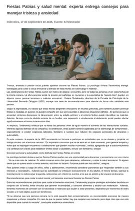 Fiestas Patrias y salud mental: experta entrega consejos para manejar tristeza y ansiedad 17-09-2025 El Mostrador Tristeza, ansiedad o presión social pueden aparecer durante las Fiestas Patrias. La psicóloga Viviana Tartakowsky entrega estrategias para cuidar la salud emocional y disfrutar de estas fechas si... |