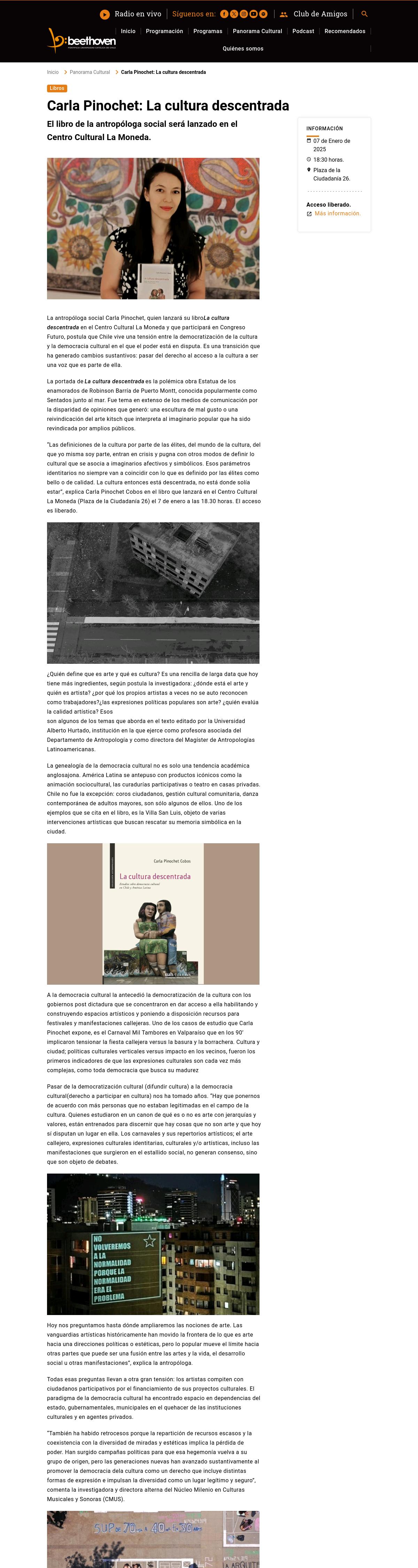 Carla Pinochet: La cultura descentrada 05-01-2025 Radio Beethoven El libro de la antropóloga social será lanzado en el Centro Cultural La Moneda. La antropóloga social Carla Pinochet, quien lanzará su libro La cultura descentrada en el Centro Cultural La Mone... |