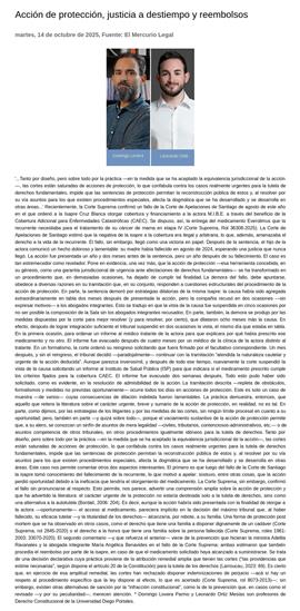Pone en evidencia, una vez más, que la acción de protección —esa herramienta concebida, en su génesis, como una garantía jurisdiccional de urgencia ante afectaciones de derechos fundamentales— se ha transformado en un procedimiento que, en demasiadas ocasiones, ha dejado de cumplir tal finalidad. La demora del fallo, debe apuntarse, obedece a diversas razones en su tramitación que, en su conjunto, responden a cuestiones estructurales del procedimiento de la acción de protección.